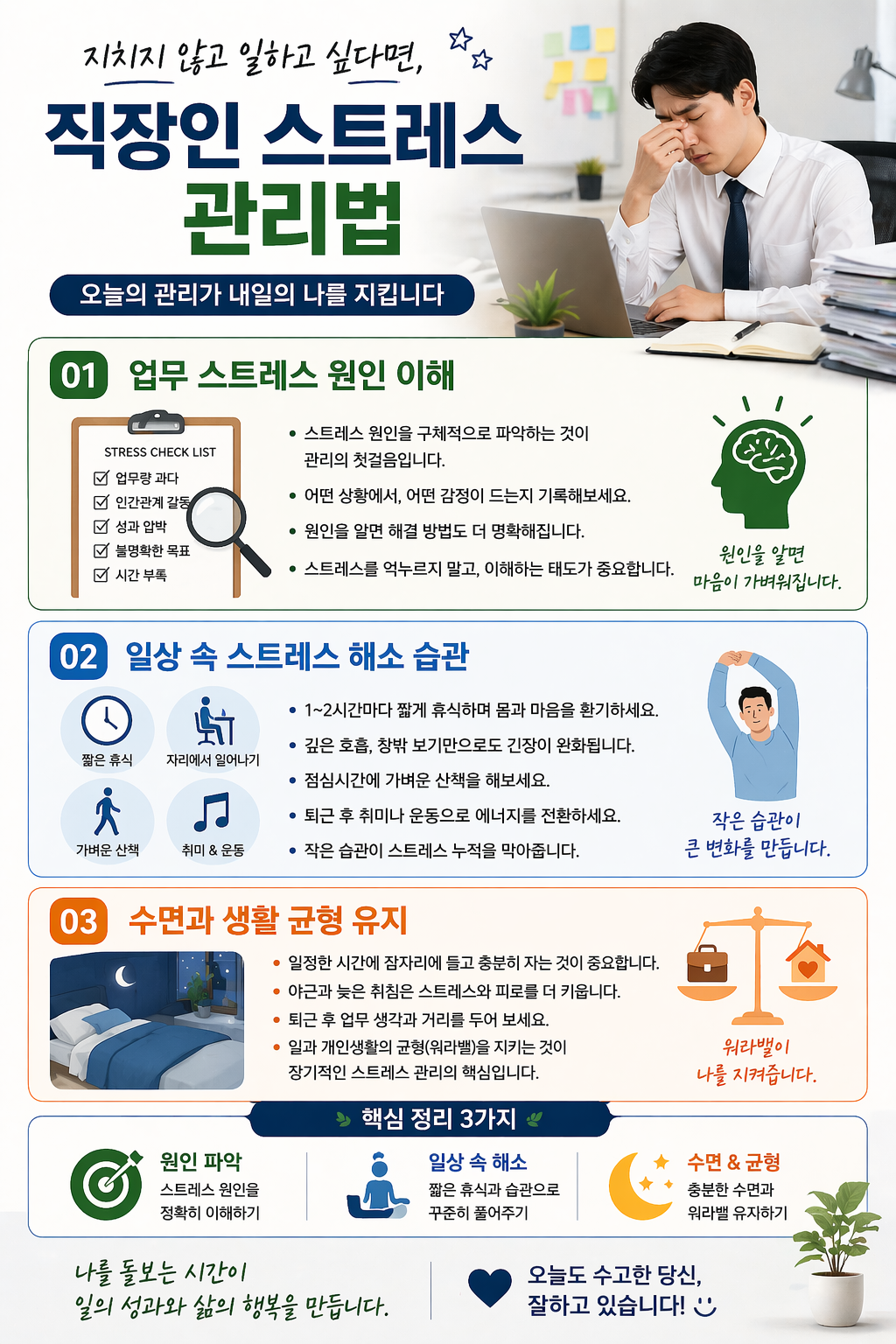 수면과 워라밸을 지키는 것이 장기적인 스트레스 관리의 핵심입니다.